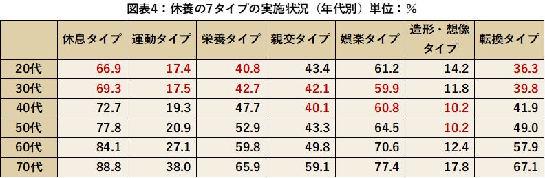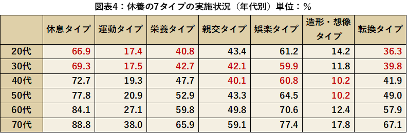 休養の7タイプの実施状況を年代別に比較していくと、実施率が低いのは休息タイプでは20代66.9%、運動タイプでは20代17.4%、栄養タイプでは20代40.8%、親交タイプでは40台40.1%、娯楽タイプでは30代59.9%、造形・想像タイプでは40代、50代ともに10.2%、転換タイプでは20代36.3%という結果となりました。