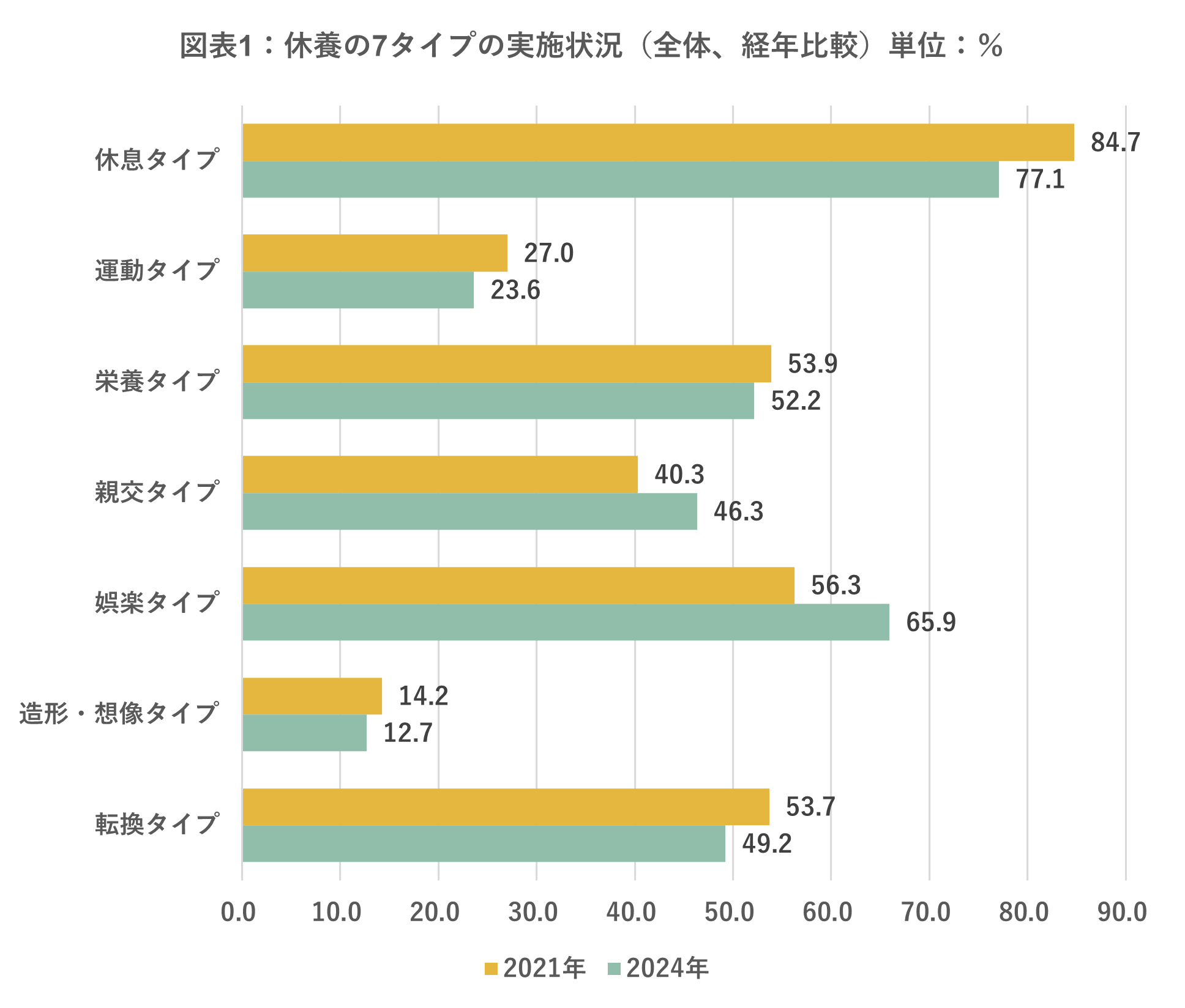 休養学基礎で定義した「休養の7タイプ」の実施状況を見ていくと、生理的休養の休息タイプ77.1%、運動タイプ23.6%、栄養タイプ52.2%、心理的休養の親交タイプ46.3%、娯楽タイプ65.9%、造形・想像タイプ12.7%、転換タイプ49.2%という結果となりました。