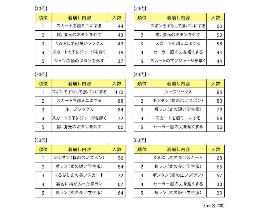 10~60代の男女1,200人に聞いた「制服の着崩し」着崩し経験が多いのは30代、流行っていたのは腰パン、超ミニ、ルーズソックス