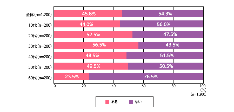10~60代の男女を対象に、学生時代の制服着崩しの有無を尋ねたところ、全体平均では制服を着崩して着ていた経験が「ある」(45.8%)と回答した人は半数以下であったのに対し、年代別にみると、30代は着崩し経験が「ある」(56.5%)という回答が全体平均に比べ10ポイント以上高いという結果になりました。