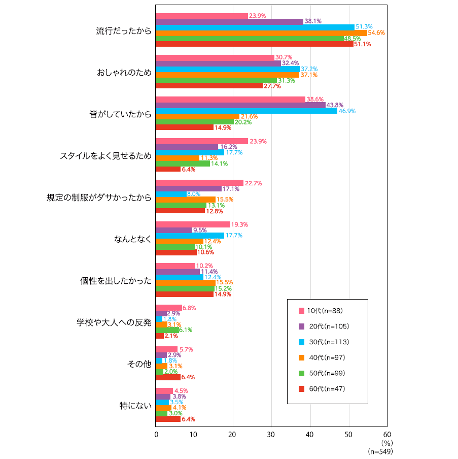 制服を着崩して着ていたと回答した549名の着崩しの理由は、「流行だったから」(40代=54.6%、30代=51.3%)が多く、次に、「おしゃれのため」、「皆がしていたから」、「スタイルをよく見せるため」でした。