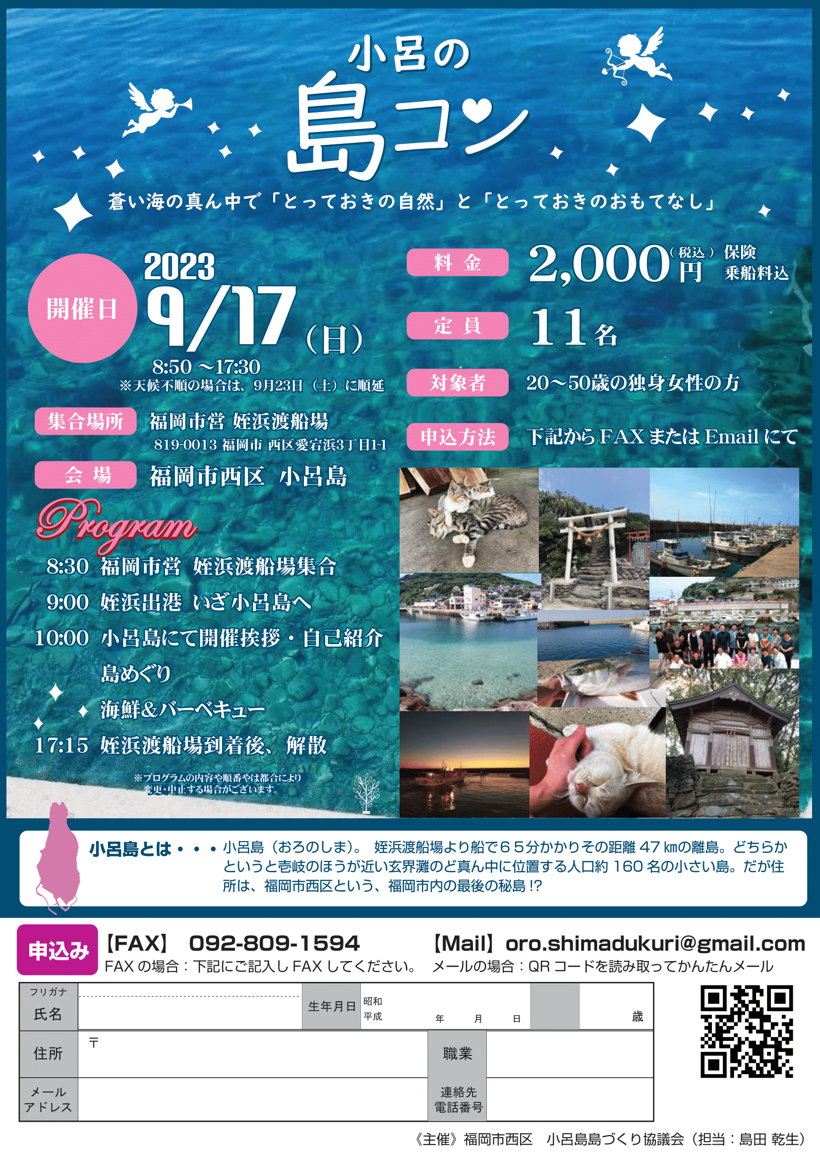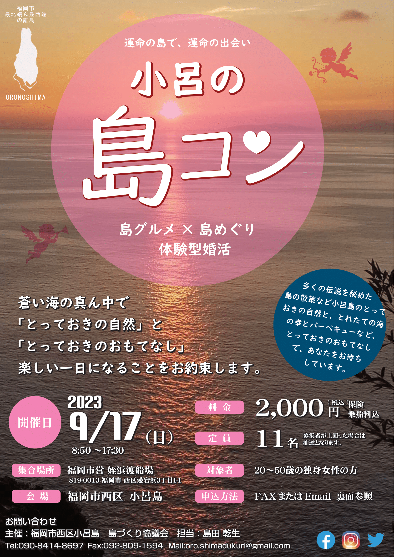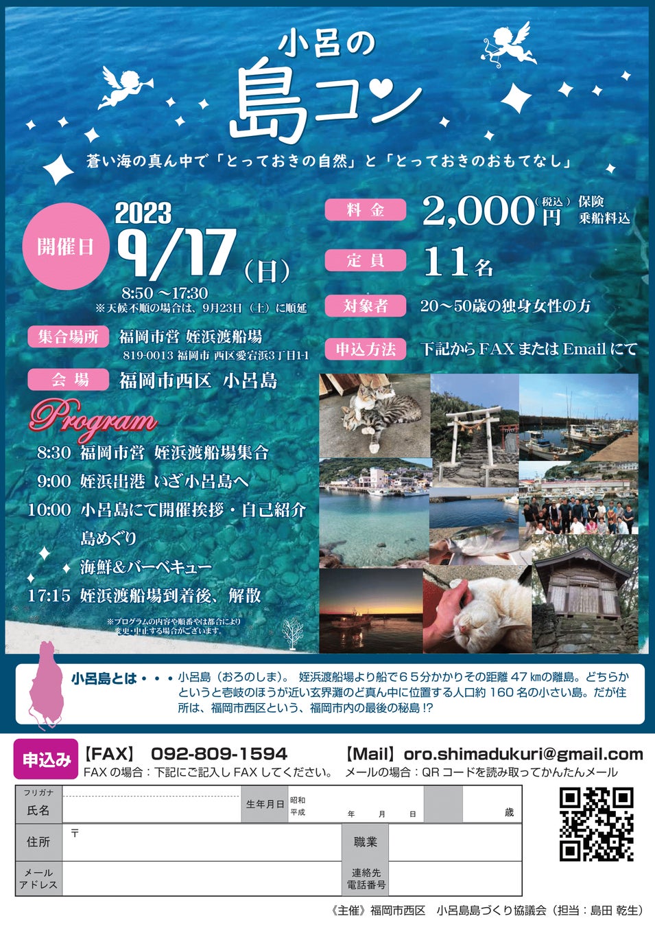2023年9月17日(日)に福岡市最北端&最西端の離島小呂島にて、地域活性化を目的とした島コンを西区小呂島主催で開催。当日は11名の方が小呂島を訪れる予定