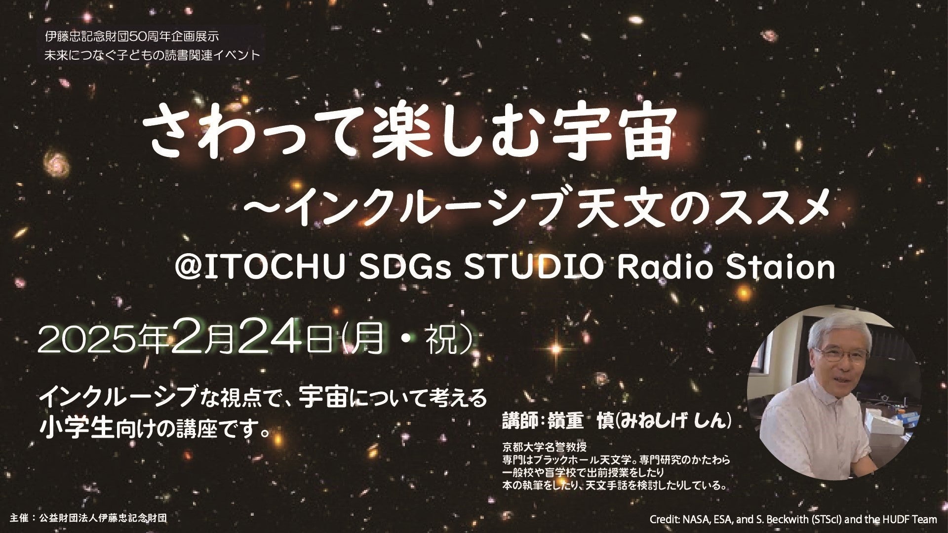 京都大学名誉教授の嶺重慎(みねしげしん)先生が、宇宙の天体や生命について、触図(しょくず)や模型を使いながら小学生向けにお話します。マルチメディアDAISY図書での読書も体験できます。