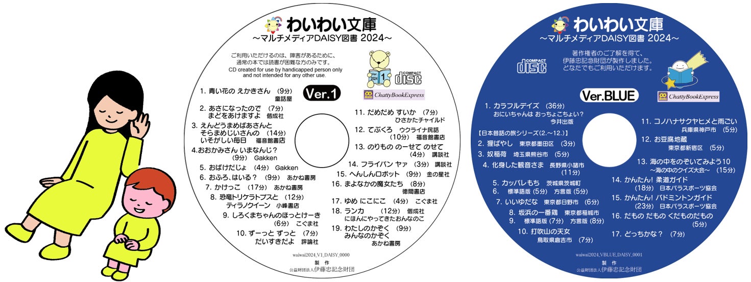 当財団が製作した「マルチメディアDAISY図書」(音声と一緒に文字や画像が表示されるデジタル図書)の愛称です。著作権法第37条第3項のもと、文化庁長官から指定団体に認可されており、障害のある方に情報提供をする場合に限り、著作権者の許諾を得ずに公表された著作物の複製や公衆送信が認められています。白いCD盤面には著作権法第37条第3項のもとでマルチメディアDAISY化した児童書(=障害がある方のみ閲覧可能な作品)を収め、青いCD盤面には普及とお試しのために、著作権者の了解を得た上で障害の有無に関わらず閲覧可能な作品を収めています。すべての子どもたちに読書の喜びや言葉・知識を身に付ける楽しさ、一冊の本を読み通したときに得られる達成感を届けられるよう、日々製作に励んでいます。