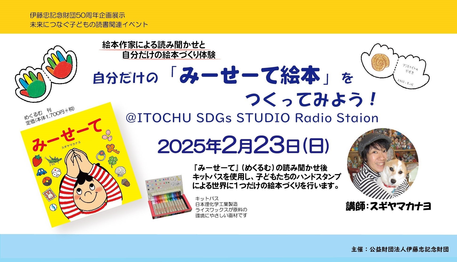 絵本作家スギヤマカナヨさんを講師に招き、ご著書『みーせーて』の読み聞かせと、ハンドスタンプによる絵本作成を行います。画材はキットパス(米ぬかから取れるワックスが原料の絵具/日本理化学工業)を使用します。