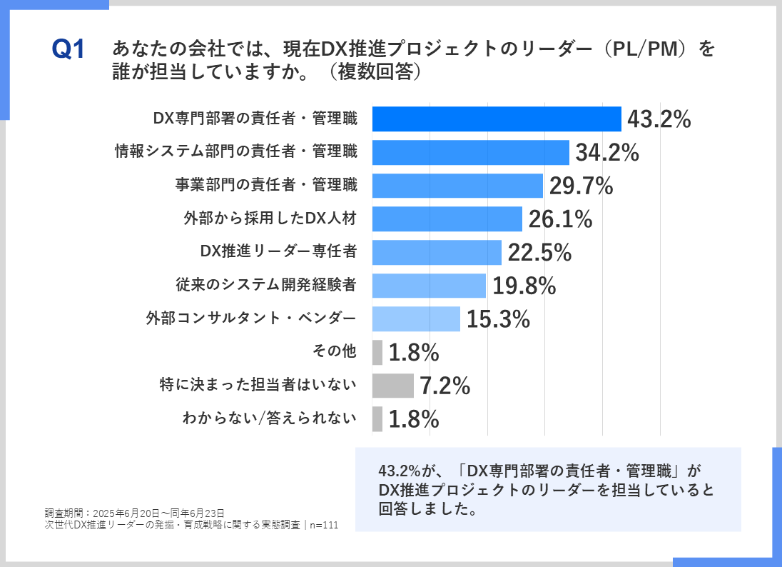 「Q1.あなたの会社では、現在DX推進プロジェクトのリーダー(PL/PM)を誰が担当していますか。」(n=111)と質問したところ、「DX専門部署の責任者・管理職」が43.2%、「情報システム部門の責任者・管理職」が34.2%、「事業部門の責任者・管理職」が29.7%という回答となりました。