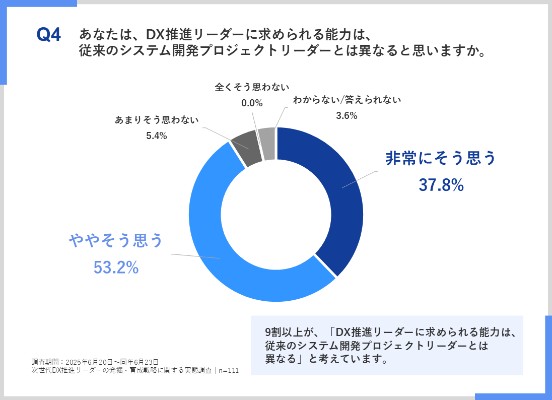 「Q4.あなたは、DX推進リーダーに求められる能力は、従来のシステム開発プロジェクトリーダーとは異なると思いますか。」(n=111)と質問したところ、9割以上が従来の能力とは異なる(「非常にそう思う」が37.8%、「ややそう思う」が53.2%)と回答しました。