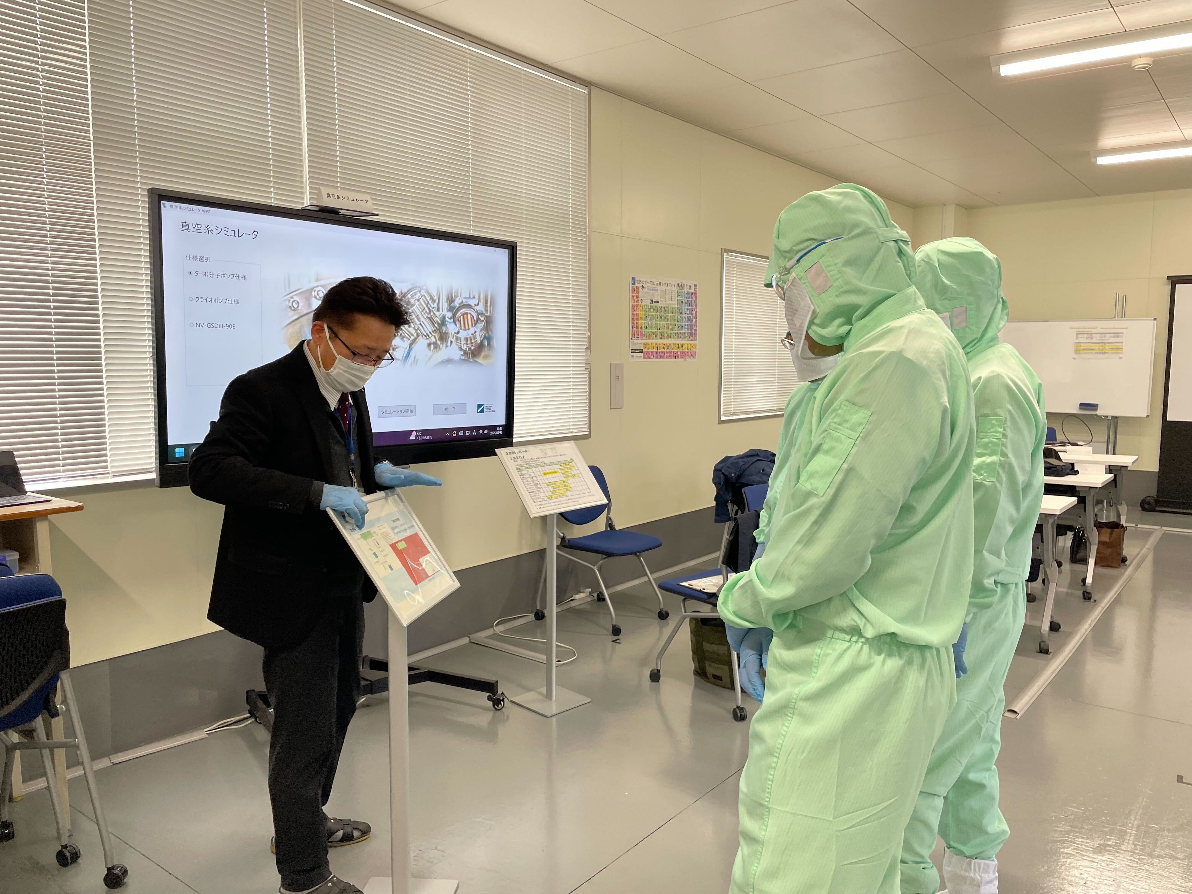 午後は、半導体製造業務の基礎となる、半導体装置の維持管理業務の実習を実施。当社で実際に実施している研修内容をもとに、現場で使用される機器を使った、基礎研修を行いました。