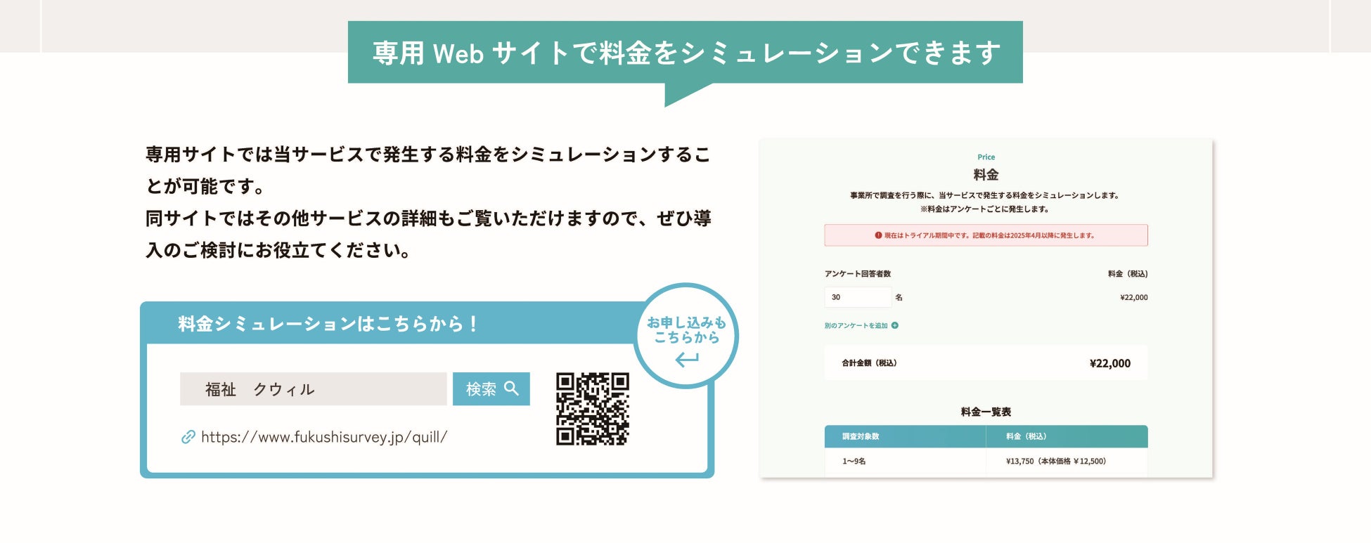 「福祉サーベイ Quill(クウィル)」は、専用サイトよりお申し込み・料金シミュレーション・機能詳細の確認が可能です。今後、有料オプションとして分析支援や改善提案機能の追加も予定しています。