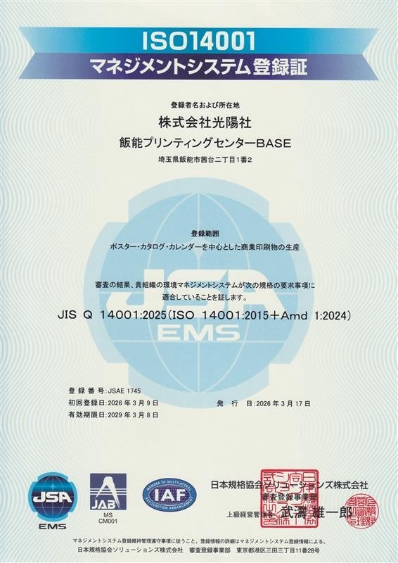 東京、大阪、名古屋を拠点に、高品質な商業印刷と環境配慮型プリントを展開する株式会社光陽社(本社:東京都文京区、代表:犬養 岬太、https://www.koyosha-inc.co.jp/)は、2026年3月、主力生産拠点である飯能プリンティングセンターBASEにおいて環境マネジメントシステムの国際規格「ISO14001:2015」の認証を取得いたしました。