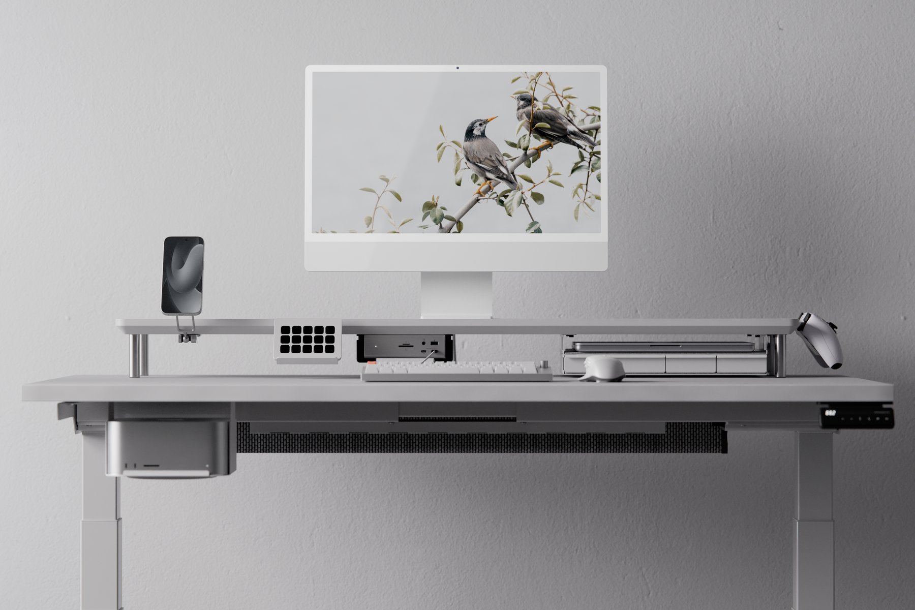 専用のモジュールは、PCや書類、書籍等を収めるトレイや、スマートフォンやガジェットを吊り下げて設置するハンガー、ゲーム機、ヘッドホン、VRデバイス等を吊るアイテムなど多種多様。配線を目立たなくするためのアダプタなども展開しており、利便性が高くスッキリしたデスク環境を構築できます。