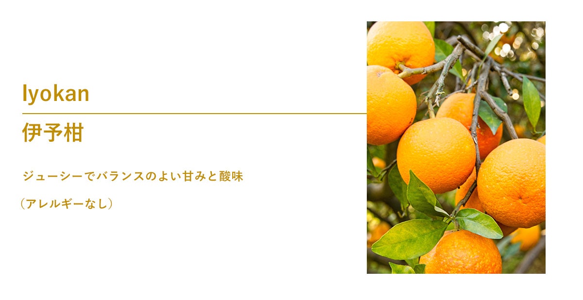 MOTTAINAI FARM様からご提供いただく愛媛県産の伊予柑を使用。果肉が柔らかくみずみずしい味わいで、絶妙なバランスの甘酸っぱさと芳醇な香りが特徴。独自の非加熱製法により、フレッシュフルーツそのままの風味を体験できる“生フレーバー”です。