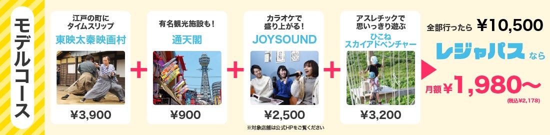 「レジャパス」は、遊園地・テーマパーク・美術館・温泉・サウナ・スポーツ観戦・カラオケなど、さまざまなジャンルの有料施設やイベントを会費のみで無制限に利用できる定額制サービスです。関西エリアでも幅広いジャンルを拡大中です。