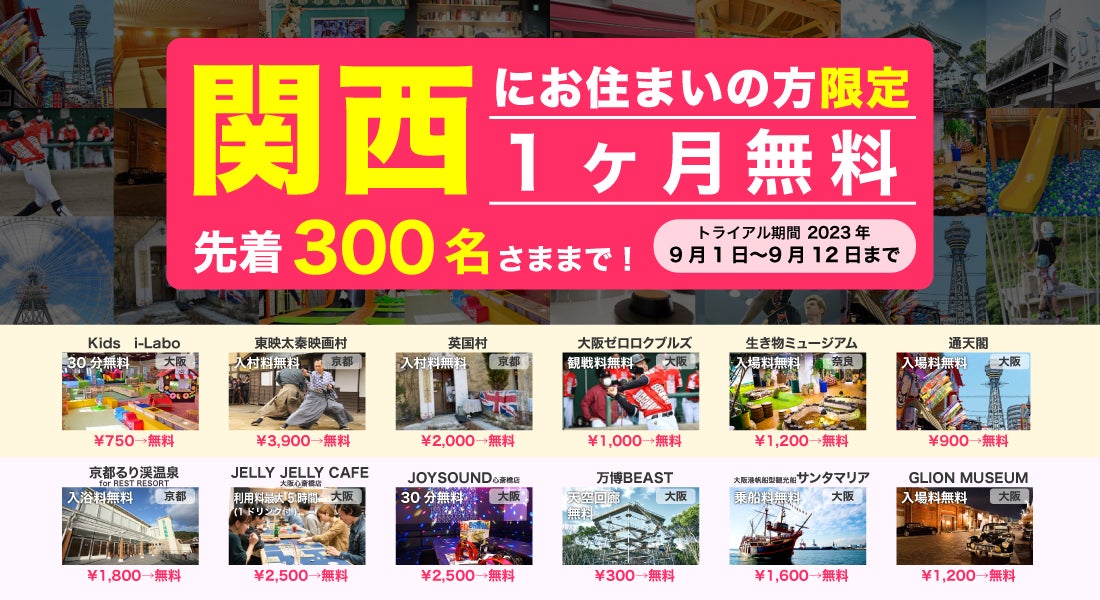 日本最大(※1)のレジャー・エンタメ定額制遊び放題サービス「レジャパス」を提供する株式会社ORIGRESS PARKS(本社:東京都品川区、代表取締役社長:吉武優)は2023年9月1日(金)~2023年9月12日(火)の期間中、関西エリア(大阪府・京都府・兵庫県・奈良県・滋賀県・和歌山県)にお住まいの方先着300名様限定でレジャパス1ヶ月無料トライアルを開催します。