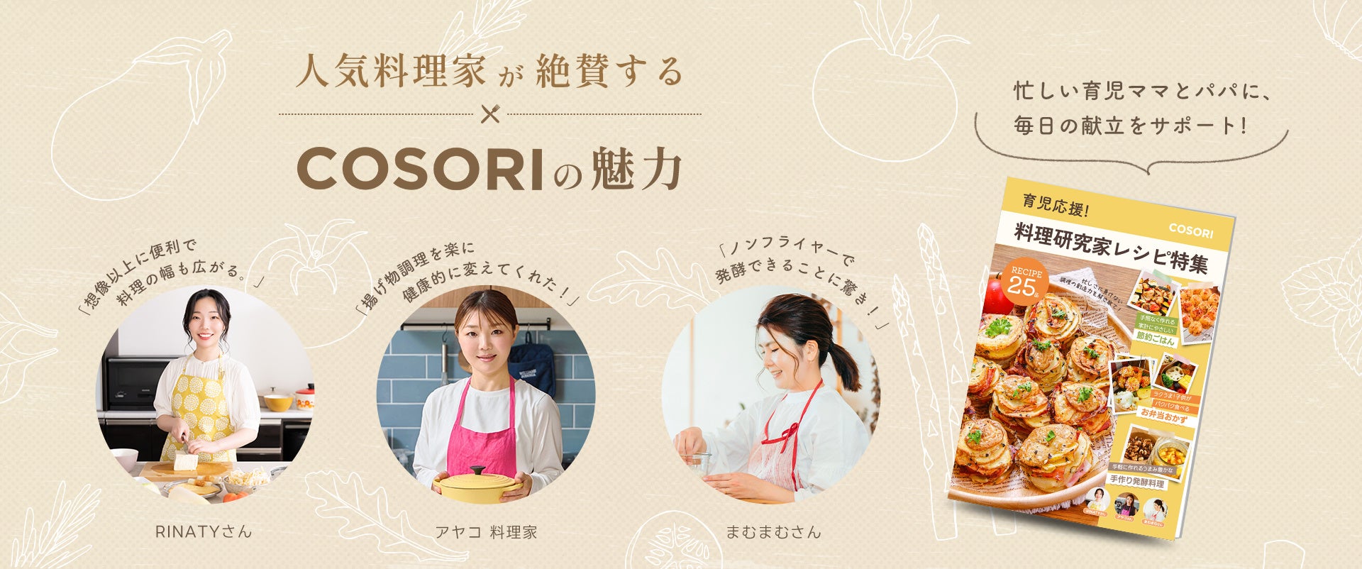 「共働きごはん」で同世代女性で人気を博した料理家RINATY(りなてぃ)さん、お弁当レシピが大好評の料理家アヤコさん、発酵料理で食生活を豊かにするまむまむさんと共同開発した総じて25レシピを掲載しています。忙しい子育て世代の味方として、日々の献立を確実に提案します。