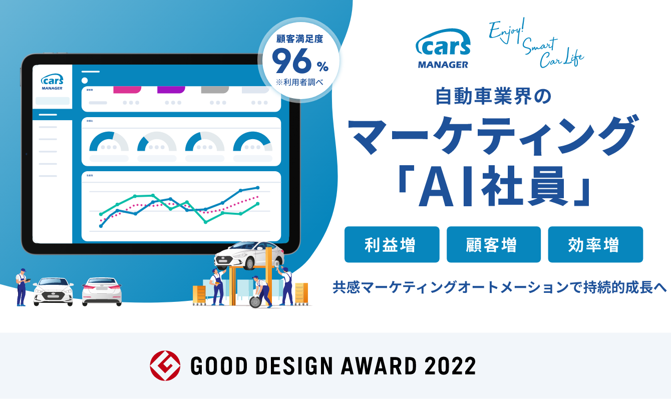 自動車業界のマーケティングAI社員による顧客のカーライフに寄り添った共感マーケティングオートメーションサービスです。AIを活用した人とクルマのカーライフデータの収集・解析により、「経営支援」「集客支援」「複業支援」に利活用することで、持続的成長による「利益増」、「顧客増」、「効率増」を実現しています。 2022年にはGood Design Award2022に選ばれています。