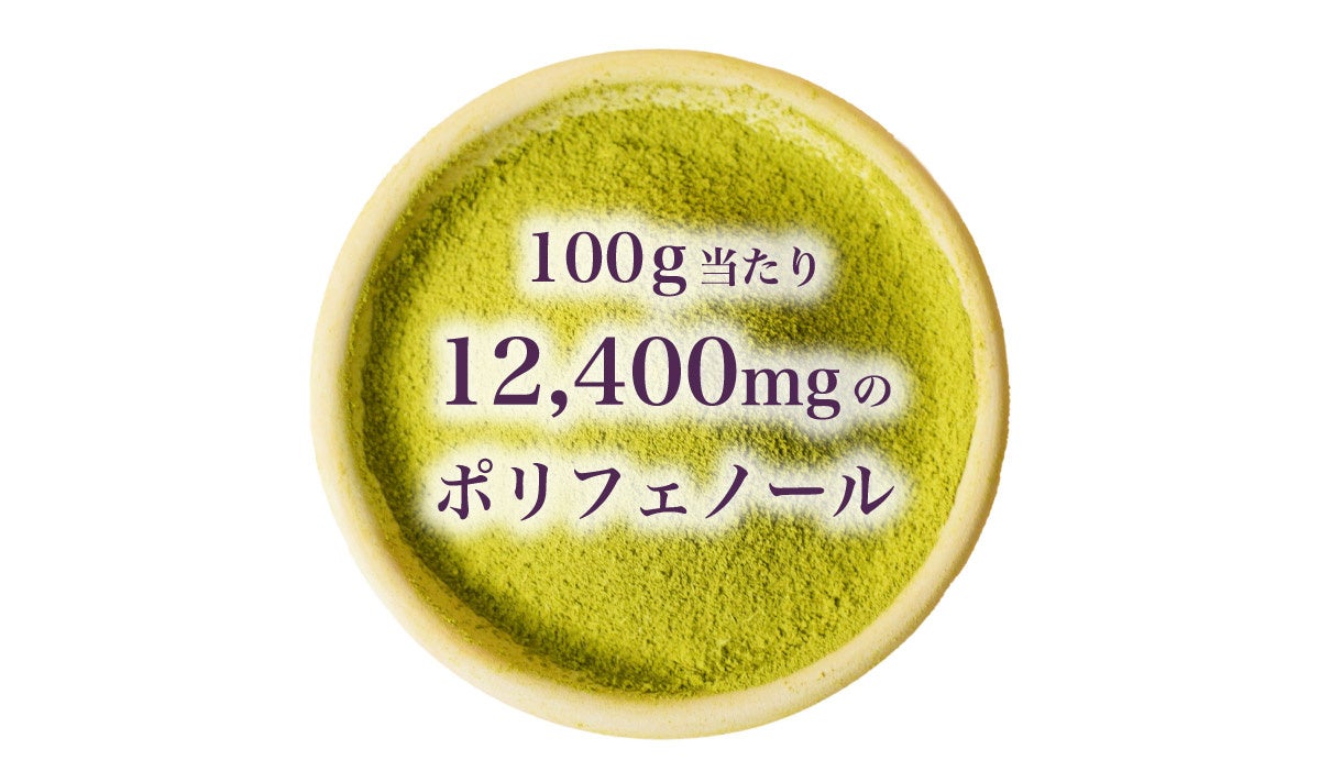 オリーブ緑茶は、オリーブ葉を丸ごと粉末にして使用しており、100g当たり12,400mg※のポリフェノールが含まれています。