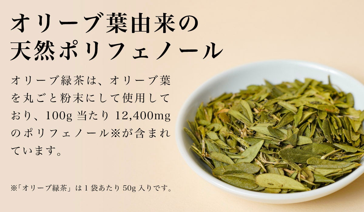 日常使いしやすい緑茶に、ポリフェノール豊富なオリーブ葉をブレンドすることで、効率よく天然のポリフェノールを摂取することができます。