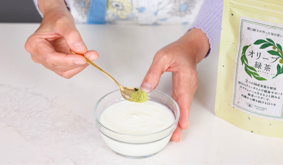 51歳で始めたYoutubeチャンネルが登録者55万人を突破し、直近1年で登録者12.8万人増加の急成長を遂げている「管理栄養士 関口絢子」。視聴者はシニア世代が半数以上を占め、次世代のウェルネスな食習慣をリードしている。そんな注目度急上昇中の関口絢子がプロデュースするブランド「ウェルネスキッチン」から、<オリーブ緑茶>が新登場。"オリーブの果実"よりも"オリーブの葉"により多くのポリフェノールが含まれていることに着目し、オリーブ葉と緑茶をまるごと粉砕してブレンド。まるでポリフェノールをそのまま食べているような贅沢なお茶に仕上げました。シニア世代の健康維持におすすめしたいポリフェノール摂取を、日常使いしやすい粉末茶で後押しします。