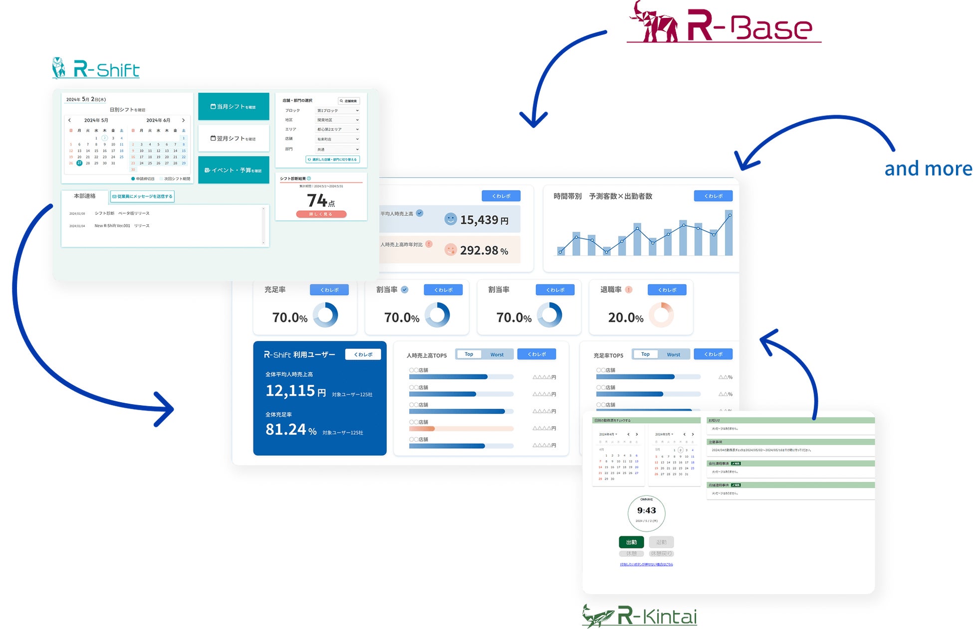 シフト管理システム「R-Shift」、勤怠管理システム「R-Kintai」、POSシステムなど、これまでバラバラに管理されていたデータが自動で集約されます。