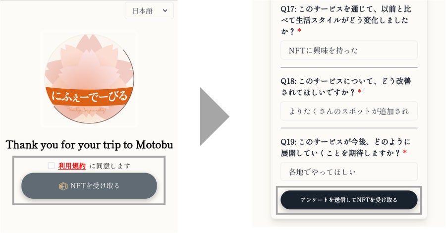 貸し切りタクシーでの観光が終わった後に、利用者はアンケートに回答することで、アンケート回答者限定NFTが受け取れます。