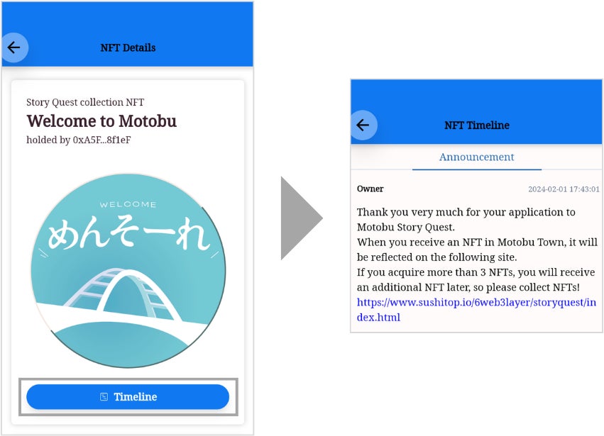 また、事前登録者向けNFTは、当社が提供する本事業用オリジナルNFTビューワー「SUSHI TOPマイアプリ」上で閲覧することができます。NFTビューワーには、NFTごとにタイムライン機能が備わっており、運営からのメッセージを閲覧することも可能です。