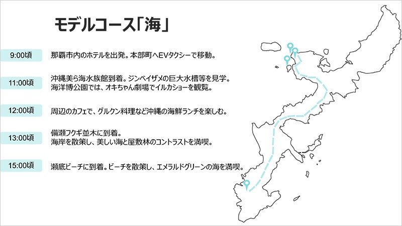 本事業は、貸切EVタクシーを利用し、魅力あふれる沖縄県・本部町の観光地を巡るサービスです。初めて沖縄県を訪れる方も安心してご利用いただけるよう、本部町の「海」「文化」「季節」を探求するための3種類のモデルコースを用意しています。自由に観光ツアーを組み立てることも可能であり、モデルコースの途中でも、魅力的な場所があれば気軽に立ち寄れることも貸切タクシーの大きな特長です。