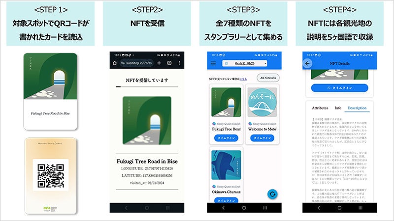 利用者は、地元の人がおすすめする穴場の観光スポットへ足を運ぶ度にNFTスタンプを獲得し、旅の思い出としてオリジナルNFTビューワー内に貯めることが可能です。NFTスタンプラリーをきっかけに、沖縄県に来るインバウンドのリピートも目指した仕掛けづくりを行います。