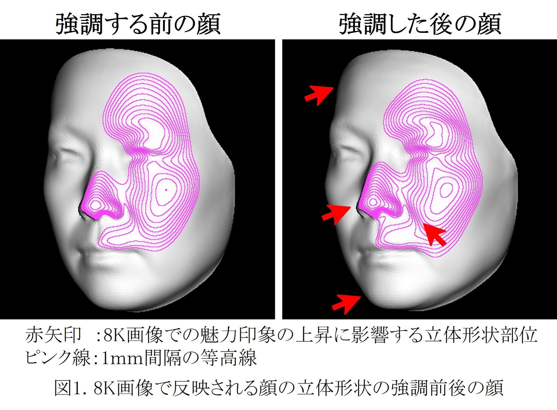 まず顔の魅力印象を調べたところ、同一の顔の間でも、8K画像では従来解像度の画像より魅力が増すことが明らかとなりました。したがって8K画像には、従来解像度の画像では再現できない、魅力に関する特徴が含まれると考えられました。次に、顔の立体形状データと、従来解像度から8Kにしたときの魅力印象の変化との対応付けを行いました。その結果、8K画像には額や鼻、頬部の起伏が反映されており、これが8K画像での魅力印象の上昇に影響していることが示されました(図1)。つまり、8K画像は平面にもかかわらず実際の顔を見たときに感じるリアルな立体形状が反映されやすく、それが魅力印象を高めた要因の一つになっていたのです。魅力印象に寄与しやすい立体形状の特徴も明らかにすることができました。