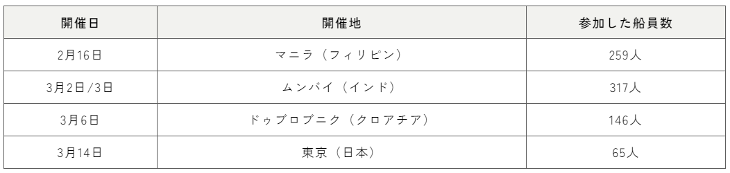 株式会社商船三井(社長:橋本剛、本社:東京都港区、以下「当社」)は、2023年2月から3月にかけて、世界4拠点で商船三井グループの安全運航を担う船員を対象とした“MOL Safety Conference 2023”を開催し、合計約800人の船員が参加しました。