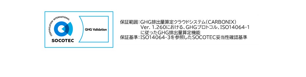この度、ソコテックによる、ISO14064-3:2019※に準拠した第三者妥当性確認を実施し、「CARBONIX」がGHG排出量算定システムとして、