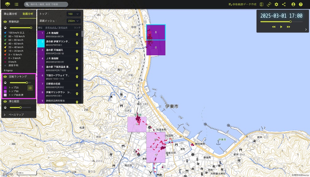 メッシュ単位の混雑状況をランキング形式で表示する「混雑ランキング機能」を追加しました。人の集中エリアをひと目で把握でき、より直感的に混雑傾向を分析できます。