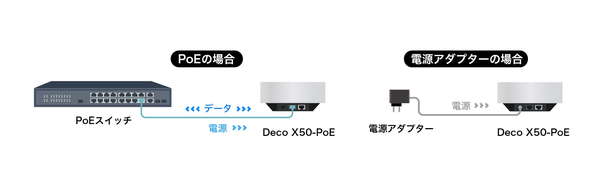 「Deco X50-PoE」はシリーズ初となるPoE対応モデルです。LANケーブル経由で給電も可能なため、これまで電源の確保が難しかった場所への設置も実現できます。