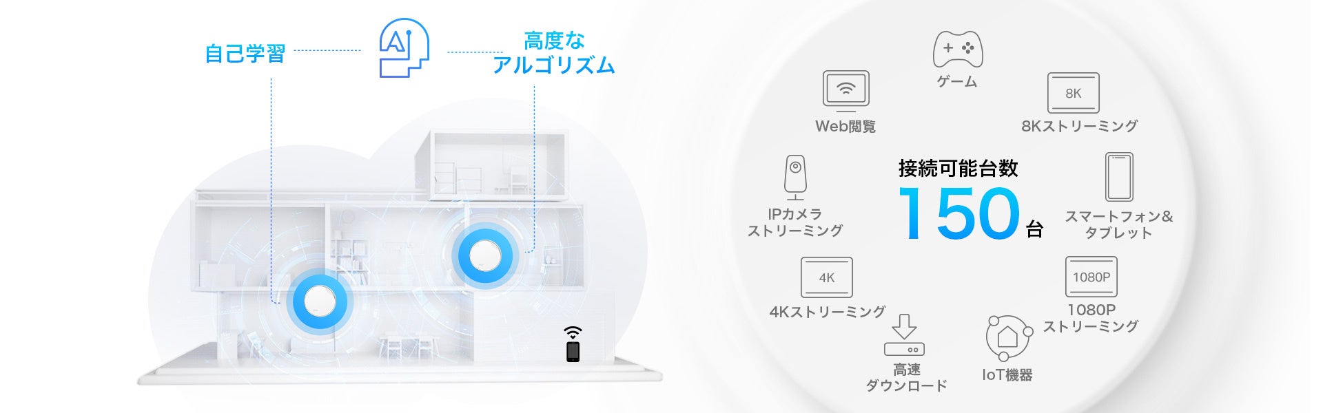 ・ AIメッシュ:ネットワーク環境を賢く学習し、各ご家庭に合った理想的なWi-Fiを提供