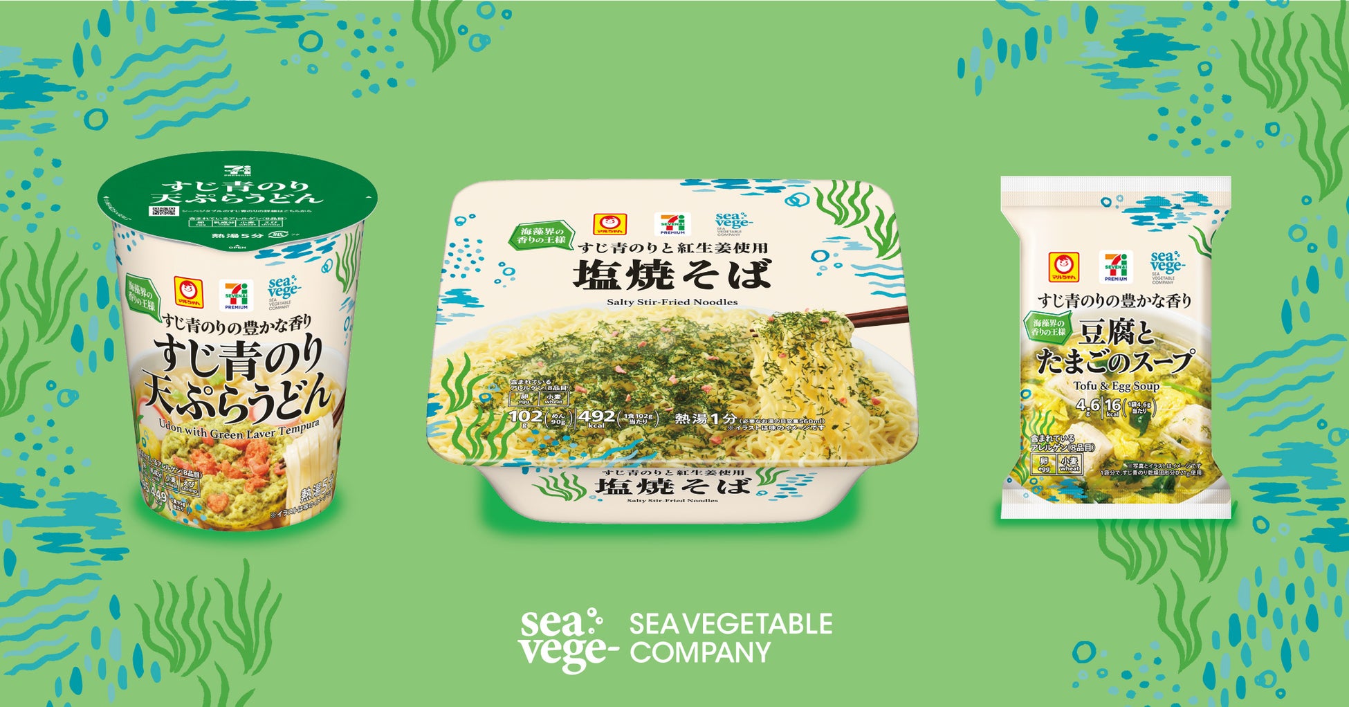 合同会社シーベジタブル(本社:高知県安芸市、共同代表:蜂谷 潤、友廣 裕一)は、株式会社セブン&アイ・ホールディングス(本社:東京都千代田区、代表取締役社長:井阪 隆一)と東洋水産株式会社(本社:東京都港区、代表取締役社長:住本 憲隆)が共同開発した商品に、シーベジタブルの香り高い「すじ青のり」が原料として採用されました。これらの新商品は、2025年4月15日(火)以降、関西地域を皮切りに全国のセブン‐イレブンやイトーヨーカドー等、セブン&アイグループ各店で順次発売いたします。