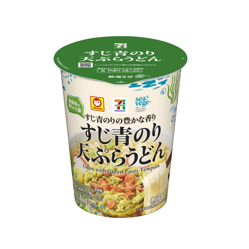 今回の新商品は、セブン&アイグループのプライベートブランド(PB)である「セブンプレミアム」から発売されます。新商品は「すじ青のり天ぷらうどん」「塩焼そば」「豆腐とたまごのスープ」の3品で、いずれもシーベジタブルで栽培したすじ青のりを贅沢に使用しています。すじ青のりは、青のりの中でも特に香り高い品種であり、「海藻界の香りの王様」と称されています。お湯を注いで調理するだけで、すじ青のりを主役にした風味豊かな味わいを手軽に楽しめます。