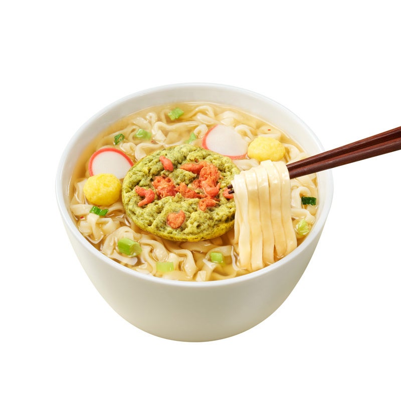 ●天ぷらに「すじ青のり」を使用 ●めん:コシが強く歯ごたえのあるうどん ●つゆ:昆布と鰹の旨みが利いた風味豊かなつゆ ●具材:すじ青のり小エビ天ぷら、たまご、かまぼこ、ねぎ |