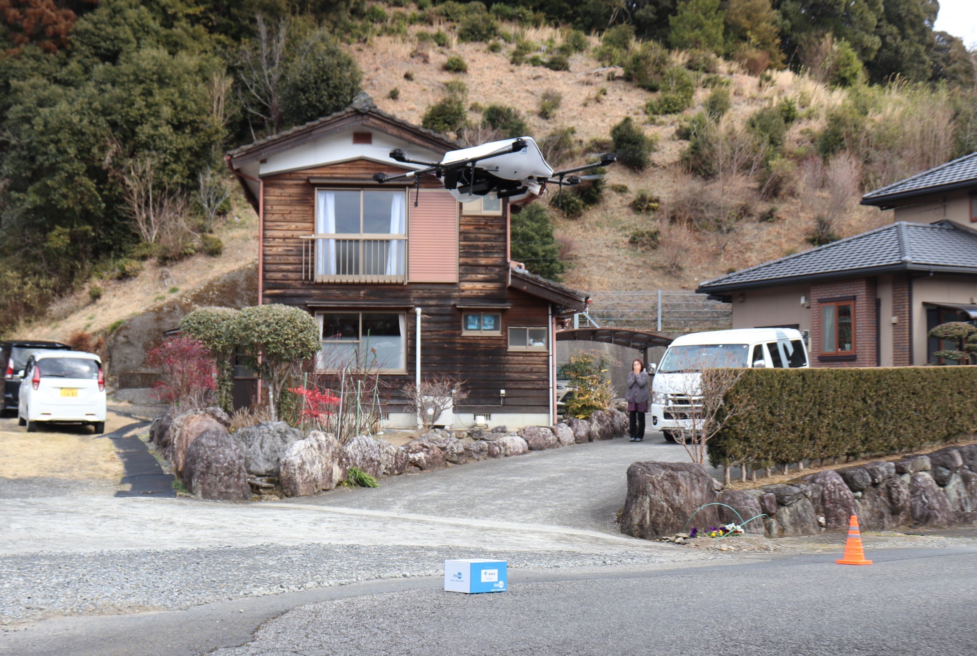 2月13日の報道関係者への公開では、宇目保健センターをドローンデポと想定し、宇目保健センターにコープサービスおおいたの荷物と宅配荷物を想定した荷物を集約し、さらに宇目保健センターから個人宅までの片道約5㎞・約13分を、2つの荷物を混載してドローン配送しました。エアロネクストが開発した物流専用ドローンAirTruckを使用し飛行レベル3.5の自動遠隔運航による飛行を実施しました。