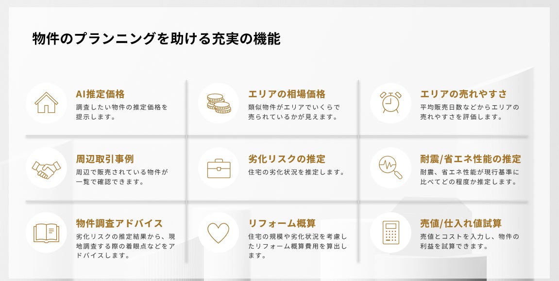 販売想定価格、リフォーム費、リスク補修費に加え、地域の売れやすさなどの情報を一元化し、誰もがプロの目線で迅速な買い取り意思決定を行える環境を提供します。