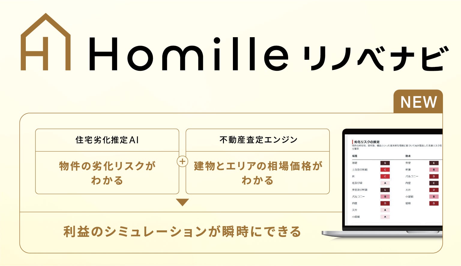 戸建住宅の建物検査や地盤調査を手掛けるジャパンホームシールド株式会社(所在地:東京都墨田区、代表取締役社長:勅使河原 隆巳)は、このたび、20年以上にわたり蓄積してきた建物検査実績をもとに開発した「住宅劣化推定AI」と、「高精度不動産査定エンジン」を融合した、戸建て買取再販・リノベーション業務支援システム「Homille(ホーミル)リノベナビ」の提供を開始しました。