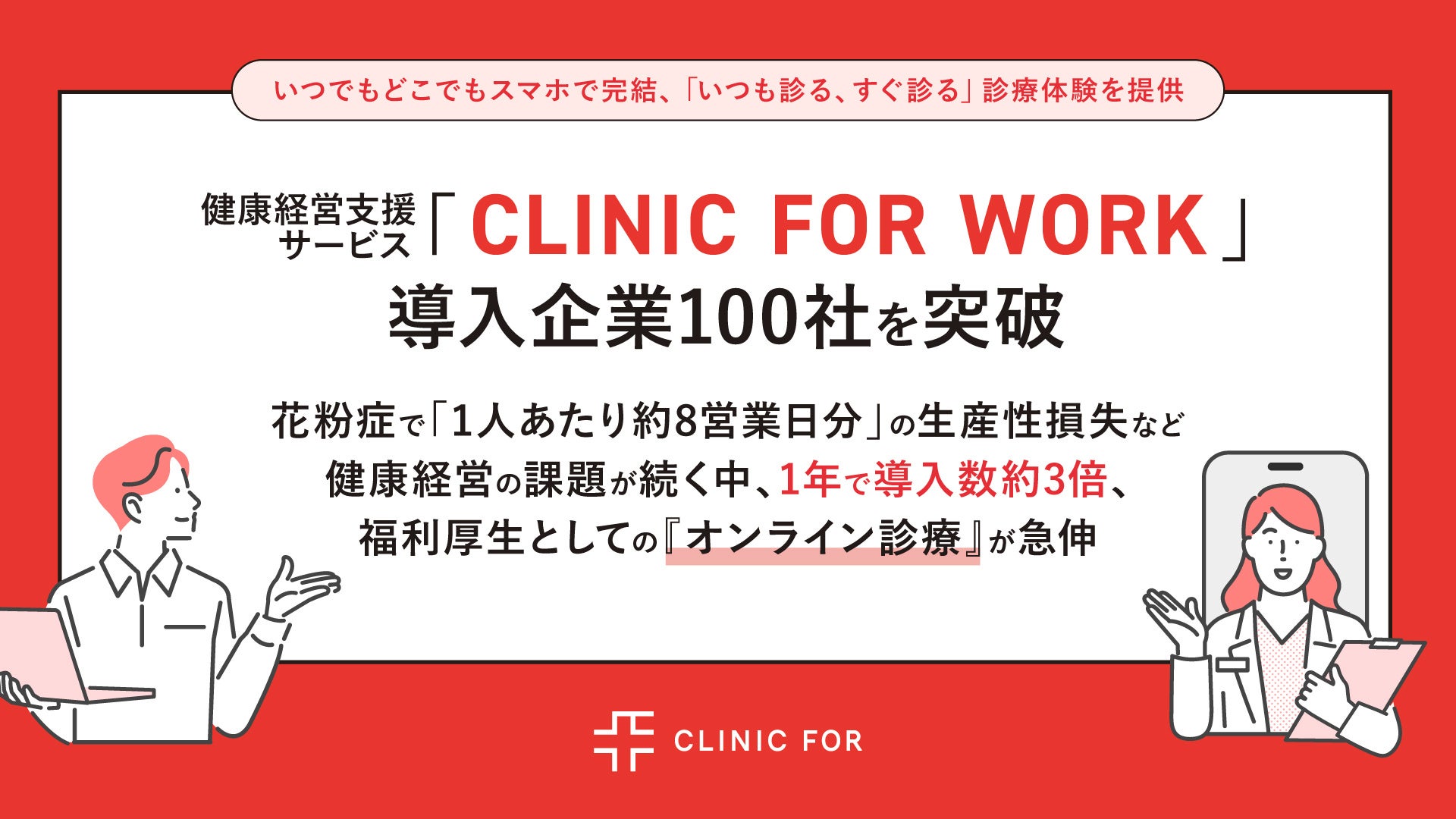対面診療と、オンライン診療を展開するクリニックフォアグループ(以下、クリニックフォア)が提供する、企業向け健康経営支援サービス「CLINIC FOR WORK」は、1年で導入企業が3倍に拡大し、2026年3月に導入企業が100社を突破しました。※2