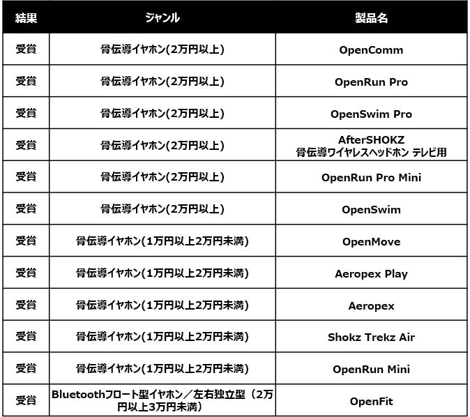 Shokzは、骨伝導部門にて「OpenRun」「OpenComm2 シリーズ」、Bluetoothフロート型イヤホン/左右独立型部門にて、「OpenFit Air」が金賞を受賞し、特別賞では「OpenSwim Pro」が企画賞を受賞しました。また、その他の12モデルも受賞し、多くのモデルを評価されました。