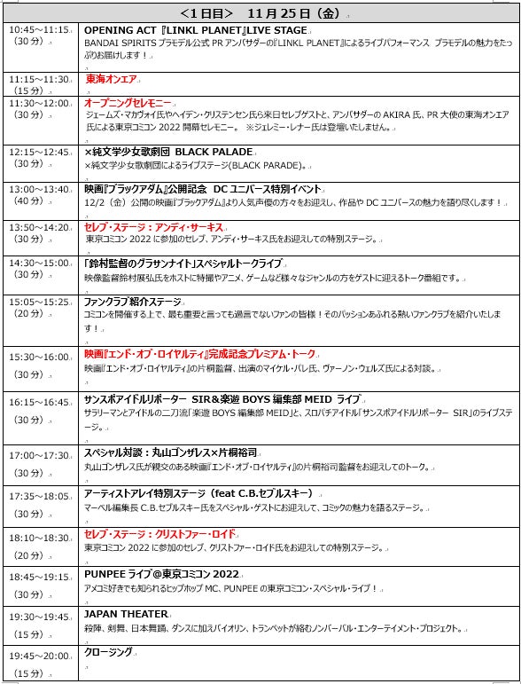 1日目となる11月25日(金)はジェームズ・マカヴォイ氏やヘイデン・クリステンセン氏ら来日セレブゲストと、アンバサダーのAKIRA氏、PR大使の東海オンエア氏が登壇するオープニングセレモニーから始まり、13:50~はアンディ・サーキス氏、18:10~はクリストファー・ロイド氏が登壇するセレブ・ステージを実施!