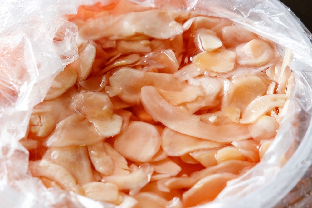 その理由について窪津は「松本農園の生姜は、味も香りも本当に素晴らしいです。だからこそ、素材そのものの風味を楽しむイタリア料理との相性が難しい」と考えていました。しかし、この日松本さんに勧められた新生姜の甘酢漬けを試食してその考えが一転。生姜の爽やかさと程よい辛味は、クセの強い魚介にマッチするとひらめきます。