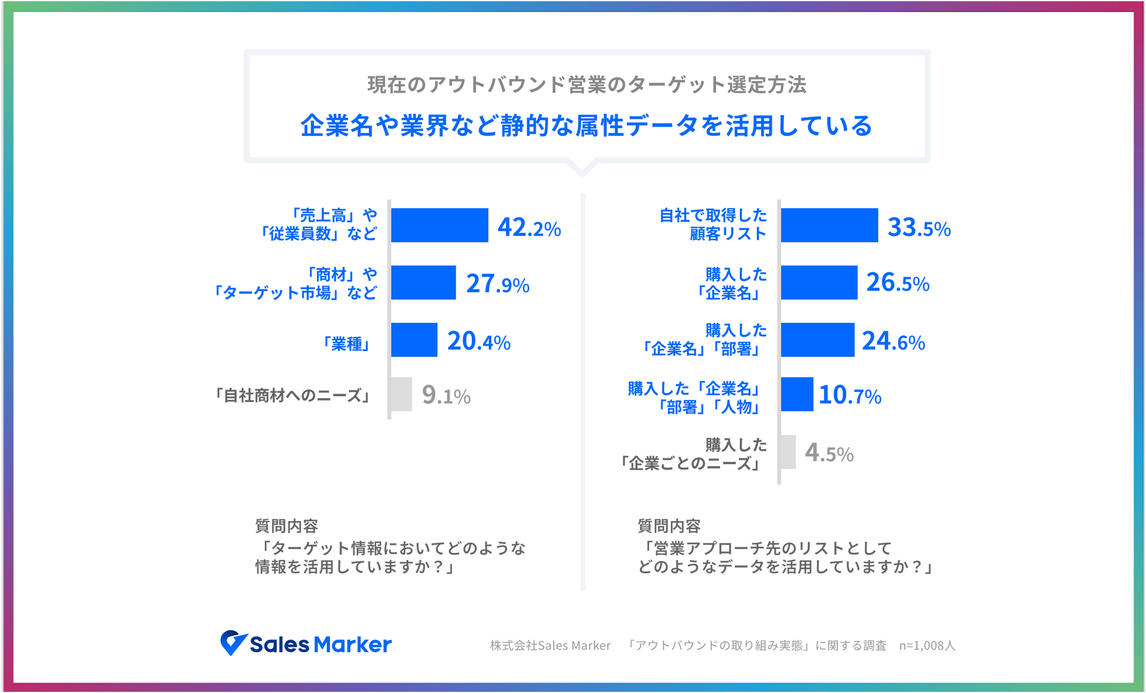ほとんどの企業が、社内外から集めた企業の属性データを基にアプローチ先を選定しており、顧客のニーズに基づいたターゲティングを実践している企業は数%のみという結果でした。