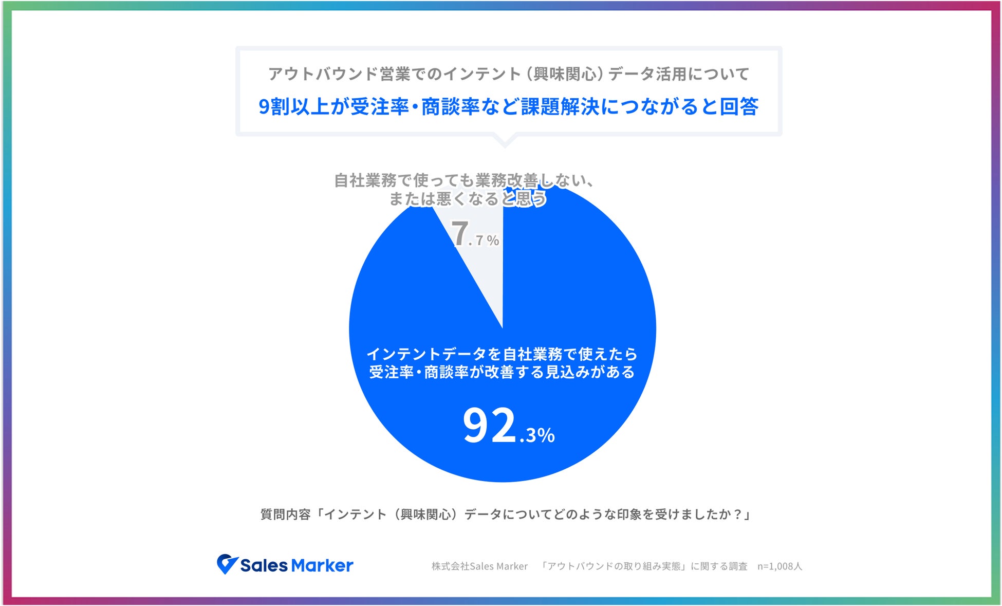 そこで、顧客のあらゆるWeb上の行動履歴を分析・可視化し、顧客の興味関心データをリアルタイムで把握できるインテントデータについてたずねた結果、92.3%が、アウトバウンド営業にインテントデータを活用できれば現在抱えている商談率や受注率といった課題が解決できると回答しました。