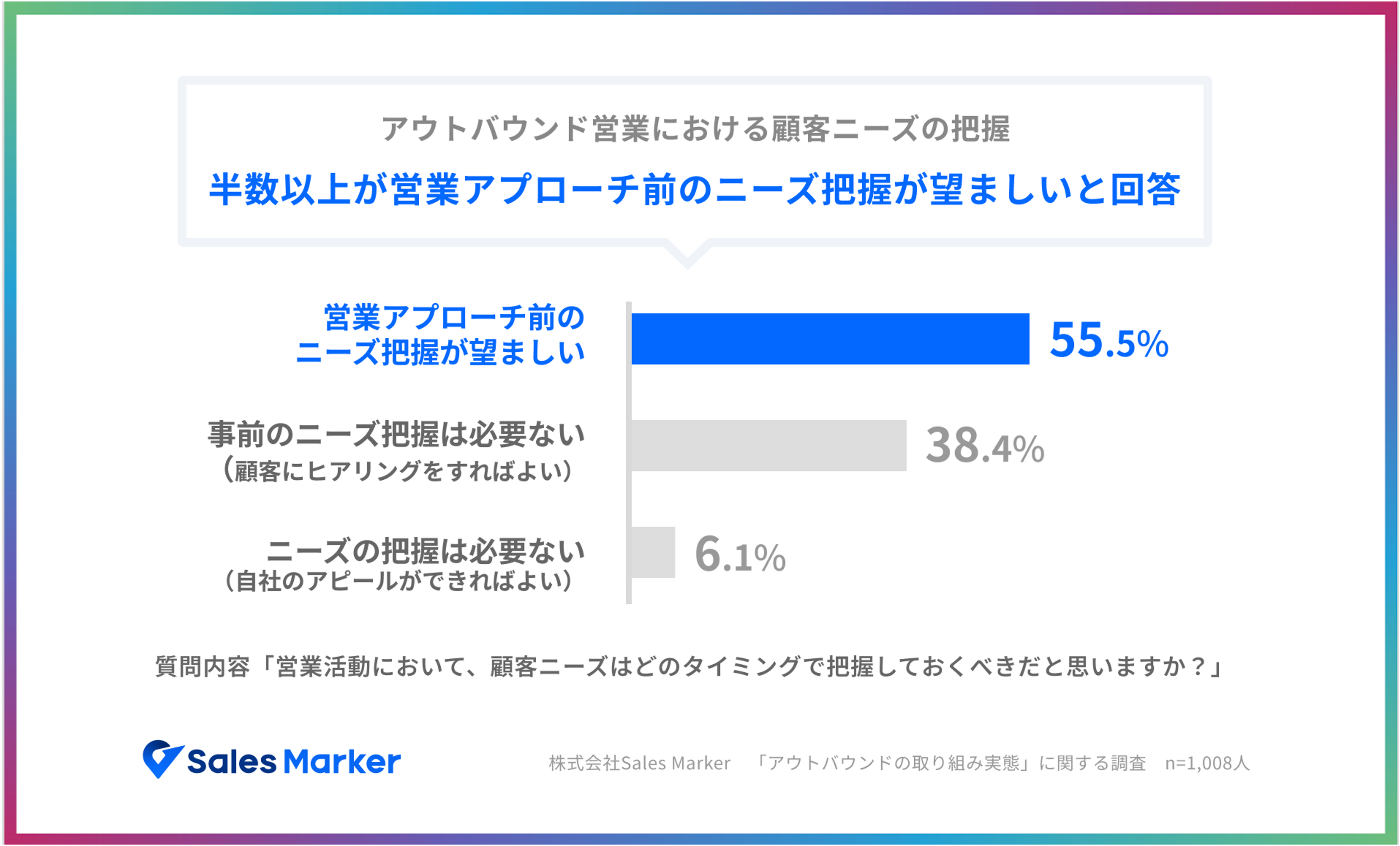 本来であればどのようなタイミングで顧客のニーズを把握をするのが望ましいかをたずねた質問に対しては、『営業アプローチの前(55.5%)』が最も多い回答となりました。