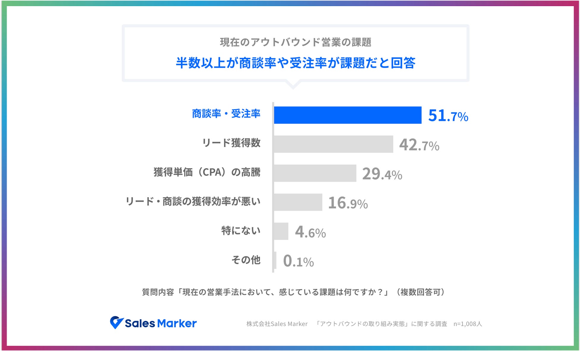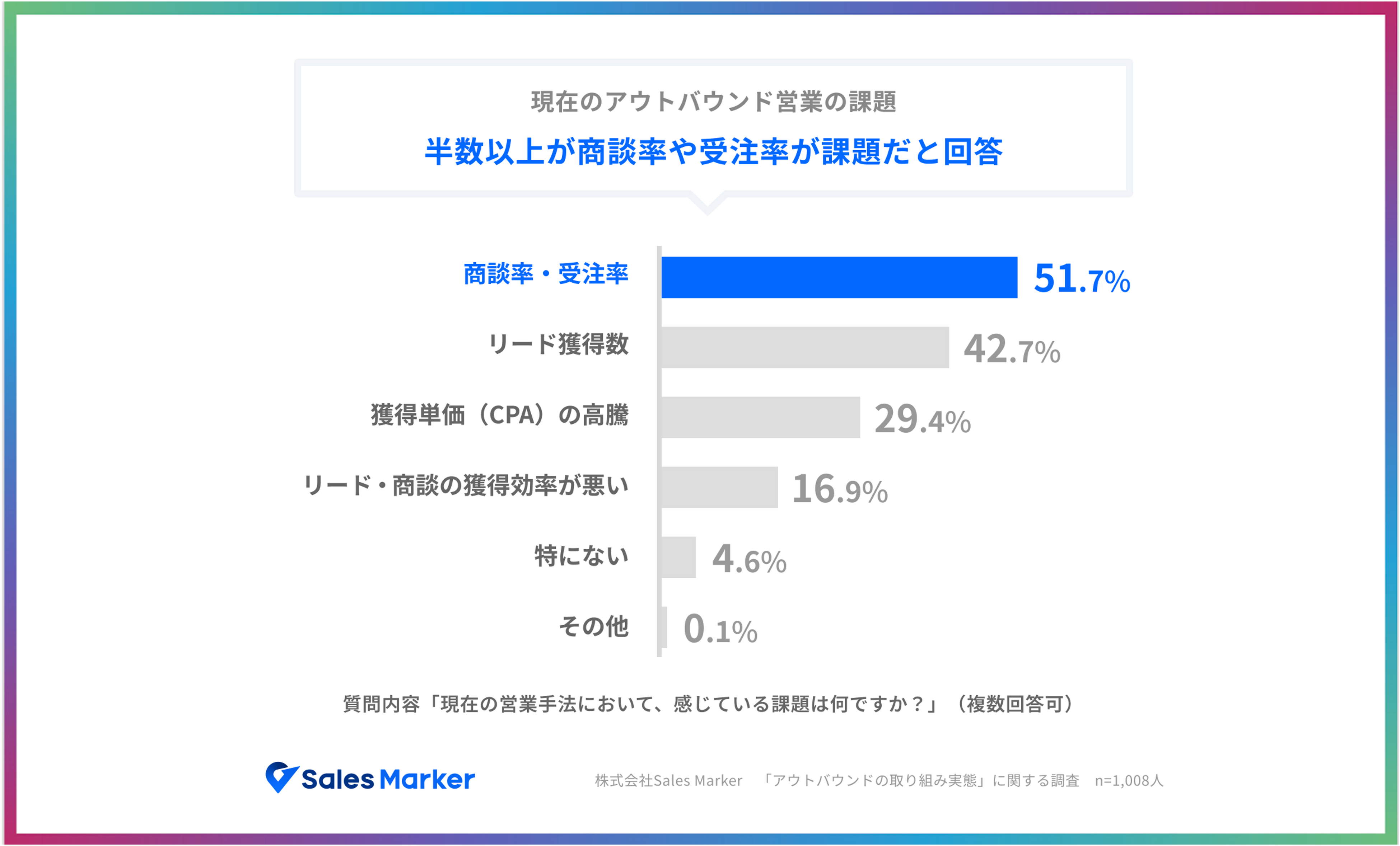 ではアウトバウンド営業で感じる課題はどうでしょうか。最も多かったのは、『商談率・受注率(51.7%)』という結果となりました。