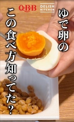 「とりあえず」のおつまみにぴったりのトレンドの卵メニュー×ベビーチーズ。ミルキーなチーズの風味の半熟卵の黄身に納豆とラー油が絡んでマイルドで、癖になる味わいに仕上げています。卵の白身を器に見立てて、簡単だけど見た目にも美味しそうな一品です。