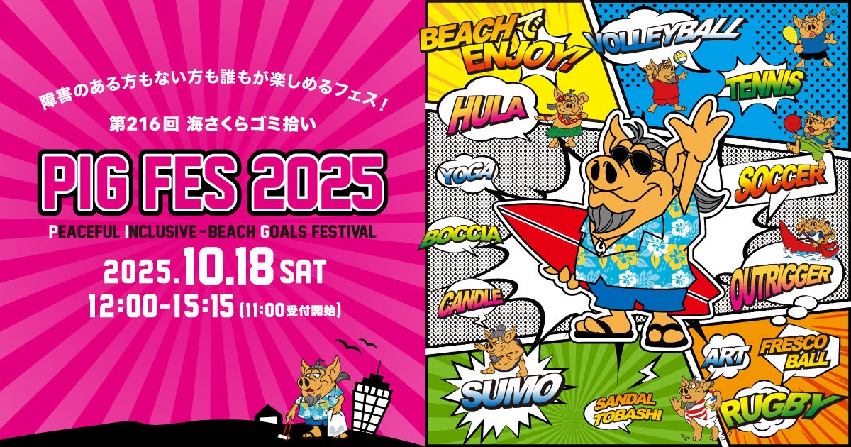 日本財団ボランティアセンター(以下日本財団ボラセン、東京都港区、会長 山脇 康)は、NPO 法人海さくら (東京都目黒区、理事長 古澤純一郎)と共催で、障害がある、ないにかかわらず、すべての方が安心・安全に楽しめる海・浜を目指すビーチクリーンイベント「Peaceful Inclusive-beach Goals Festival 2025(第216回海さくらごみ拾い)」(略称: PIG FES 2025)を10/18(土)に神奈川県藤沢市の片瀬東浜海岸で開催します。申し込みはPIG FES特設サイトにて受付中です。(一般の方:10/17(金)まで/障害のある方:10/9(木)まで)。